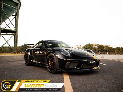 Porsche thay đổi màu sắc bằng dịch vụ dán đổi màu ô tô, mã AD1190 Ultra Gloss Piano Black của dòng Ax Wrap Film cao cấp, đơn vị thi công – Wrapstudio.